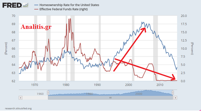 Και η τάση αυτή ίσως να μην ήταν απειλητική για την αμερικανική και κατ’ επέκταση για τη διεθνή οικονομία αν αναμενόταν αντιστροφή της αλλά κάτι τέτοιο δε θα είναι εύκολο να συμβεί καθώς τα επιτόκια των στεγαστικών δανείων βρίσκονται σε ιστορικά χαμηλά επίπεδα, ακολουθώντας τα επιτόκια της Αμερικανικής Κεντρικής Τράπεζας, με τα τελευταία να αναμένεται να αρχίσουν να ανεβαίνουν από το Δεκέμβριο για πρώτη φορά στα τελευταία οκτώ χρόνια, επηρεάζοντας αυξητικά και τα στεγαστικά επιτόκια.