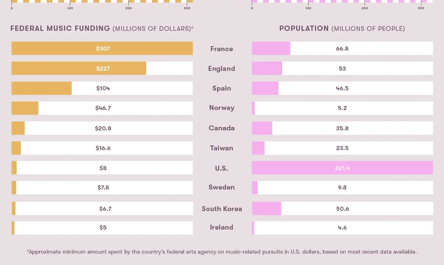 Στη Νότια Κορέα η κυβέρνηση επιδοτεί σταθερά τη μουσική στηρίζοντας το εξαγώγιμο προϊόν της K-pop. Η Ισπανία προϋπολογίζει περίπου 5,5 εκατομμύρια δολάρια, σε εθνικό και περιφερειακό επίπεδο, για την εξαγωγή της μουσικής της στο εξωτερικό. Η Γαλλία δε, που ανέφερε η κ. Μενδώνη, είναι πρώτη παγκοσμίως στις μουσικές επιδοτήσεις, προωθώντας ονόματα όπως οι Amadou & Mariam, Justice, Charlotte Gainsbourg κ.α. επενδύοντας πάνω από 300 εκ. δολάρια ετησίως για τη μουσική της. Στην Πορτογαλία, η στήριξη γίνεται μέσα από τον φορέα WHY Portugal που και αυτός είναι σύμπραξη δημόσιου-ιδιωτικού τομέα. Και πάει λέγοντας.