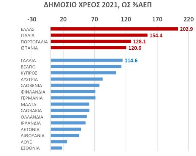 Μακράν πιο βεβαρημένη περίπτωση βρίσκεται να είναι η Ελλάδα με δημόσιο χρέος που πέρυσι άγγιξε το 203% του ΑΕΠ και είναι πλέον το υψηλότερο παγκοσμίως. Έχει όμως ένα κρυφό πλεονέκτημα γιατί στο μεγαλύτερο μέρος του είναι οφειλές προς κράτη και ευρωπαϊκούς οργανισμούς, άρα δεν κινδυνεύει να γίνει απαιτητό «εδώ και τώρα» από τις ανυπόμονες αγορές που «μυρίστηκαν αίμα και ορμάνε» όπως έγινε το 2010. Επιπλέον οι δόσεις αποπληρωμής είναι φιξαρισμένες σε βάθος χρόνου και προς το παρόν τουλάχιστον δεν εγείρουν αξεπέραστα προβλήματα διαχείρισης.