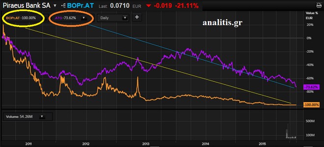 Είναι από εκείνα τα πράγματα που διαβάζει κανείς μόνο στα βιβλία και τα οποία θεωρεί ότι είναι απίθανο αν όχι αδύνατο να δει ο ίδιος να γίνονται πραγματικότητα. Ποιος θα μπορούσε, πράγματι, να φανταστεί ότι η μετοχή της ΠΕΙΡΑΙΩΣ, μίας από τις συστημικές τράπεζας της Ελλάδας, θα μπορούσε να καταγράψει πτώση όχι 40 ή 50 αλλά .. 100%!! Δηλαδή να φτάσει στον εκμηδενισμό της.