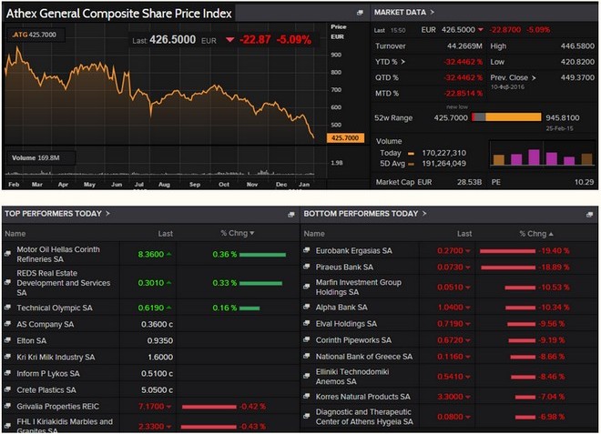 Το Χρηματιστήριο Αθηνών βιώνει την ολοκληρωτική του καταστροφή. Την Πέμπτη καταγράφει νέο ιστορικό χαμηλό στις 426 μονάδες με απώλειες άνω του 5,00%. Από την αρχή του έτους χάνει 32,4% και μέσα στο Φεβρουάριο χάνει 22,8%.