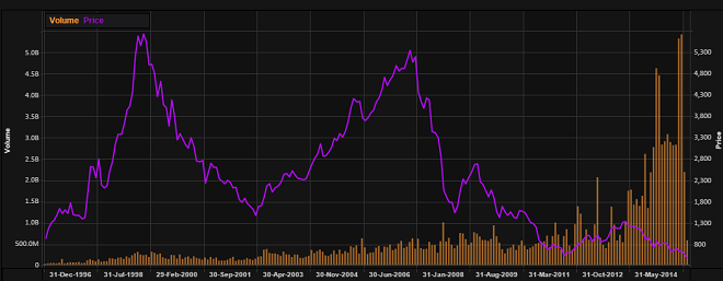 Από το Φεβρουάριο του 2015 και μετά οι τιμές του χρηματιστηρίου κατέρρευσαν ενώ ο όγκος συναλλαγών σε αυτό εκτοξεύτηκε στο υψηλότερο σημείο στην ιστορία, ξεπερνώντας ακόμη και κατά 500% τον ιστορικό του μέσο όρο