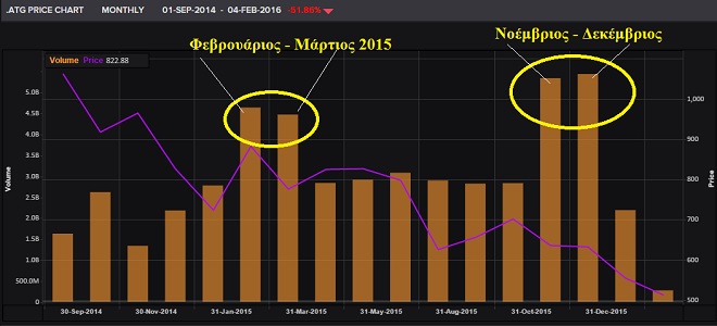 Τοποθετώντας τα συγκεκριμένα διαστήματα τιμών και όγκου στο χρόνο, διαπιστώνουμε πως τα πιο ακραία σημεία τους βρίσκονται μεταξύ Φεβρουαρίου και Μαρτίου 2015, στο διάστημα που η Ελλάδα υιοθέτησε τη διαπραγματευτική τακτική του πρώην υπουργού Οικονομικών Γιάνη Βαρουφάκη και στο διάστημα Νοεμβρίου – Δεκεμβρίου 2015, όταν και είχαμε την άρση των capital controls στο χρηματιστήριο, σε πρώτη φάση για τους ξένους επενδυτές και αμέσως μετά και για τους Έλληνες (διάγραμμα 4).