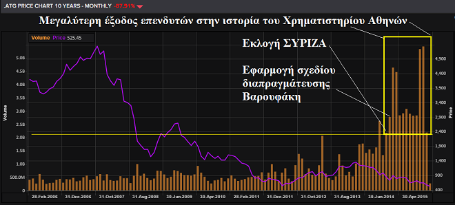 Από την αρχή του έτους ο ΓΔ έχει χάσει το 26% της κεφαλαιοποίησης του σε αυτό που φαίνεται να είναι η μεγαλύτερη έξοδος επενδυτών στην ιστορία του χρηματιστηρίου, με σημείο εκκίνησης της την εφαρμογή του σχεδίου διαπραγμάτευσης Βαρουφάκη, μετά την πρώτη εκλογή ΣΥΡΙΖΑ. Πράγματι, από το Φεβρουάριο του 2015 και μετά οι τιμές του χρηματιστηρίου κατέρρευσαν ενώ ο όγκος συναλλαγών σε αυτό εκτοξεύτηκε στο υψηλότερο σημείο στην ιστορία, ξεπερνώντας ακόμη και κατά 500% τον ιστορικό του μέσο όρο (Διάγραμμα 1 & Διάγραμμα 2)