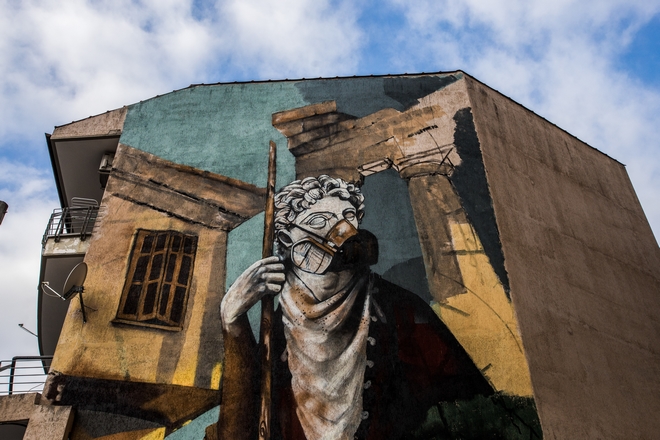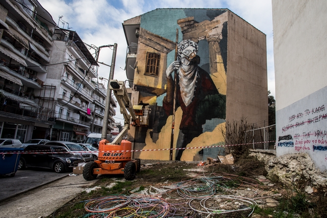 Για να σχεδιάσει πάνω στον 15 μέτρων «καμβά» χρειάστηκε γερανοφόρο όχημα και συνολικά πέντε μέρες συστηματικής δουλειάς, που απέδωσαν μια εντυπωσιακή τοιχογραφία, στην οποία ένα αρχαιοελληνικό άγαλμα απεικονίζεται να φορά μάσκα και να βρίσκεται ανάμεσα σε δυο κόσμους, τον σύγχρονο και τον αρχαίο. Το άγαλμα κρατά στο χέρι του ως όπλο και δεκανίκι ένα κοντάρι.