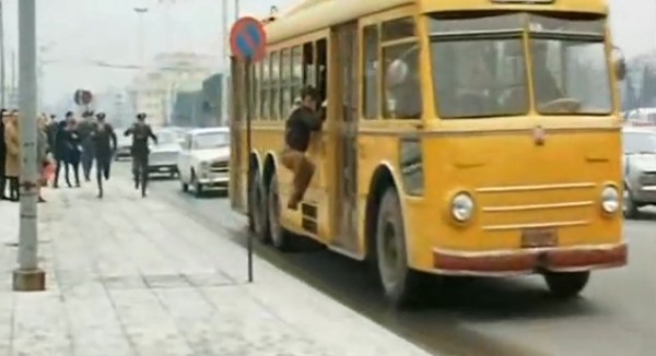 Κάποιος θα μπορούσε να σκεφτεί, ότι συχνά τα μέσα μαζικής μεταφοράς γέμιζαν ασφυκτικά και οι τελευταίοι επιβάτες σκαρφάλωναν ριψοκίνδυνα στην πόρτα για να μπουν μέσα, έστω και την τελευταία στιγμή. Όμως, αυτός ο κύριος δεν είναι επιβάτης και ο δρόμος -αν και λεωφόρος- εκείνη την ώρα, δείχνει να έχει φυσιολογική κίνηση. Με άλλα λόγια, ετοιμαστείτε για την αποκάλυψη του γρίφου, που είναι κινηματογραφικός!