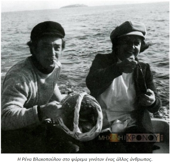 Από τη mixanitouxronou.gr: Οι πιο αγαπημένες φωτογραφίες απο το προσωπικό αρχείο της Ρένας Βλαχοπούλου είναι αυτές που την δείχνουν να ψαρεύει. Στα χέρια της κρατάει δύο αστακούς και δίπλα της στέκεται ένας ψαράς που κρατάει δύο ψάρια. Είναι χαμογελαστή, καθώς η ψαριά ήταν πολύ καλή.