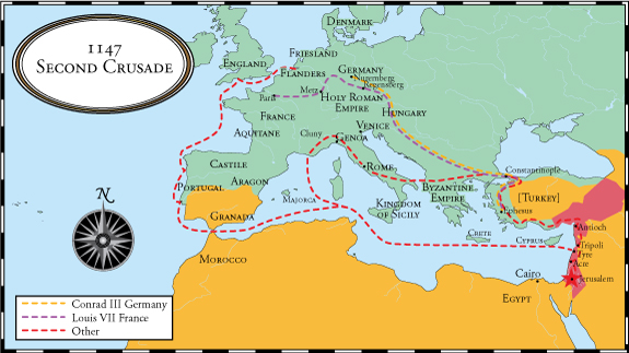 Η δεύτερη Σταυροφορία ξεκίνησε το 1147 με επικεφαλής τον βασιλιά Λουδοβίκο Ζ της Γαλλίας και τον βασιλιά Κονράδο ΙΙΙ της Γερμανίας.Το 1144, ο σουλτάνος των Σελτζούκων, στρατηγός Ζενγκί, κυβερνήτης της Μοσούλης, κατέλαβε την Έδεσσα, με αποτέλεσμα την απώλεια του βορειότερου τμήματος του κράτους των Σταυροφόρων
