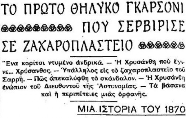 Ένα απόγευμα του 1870, στην Αθήνα, μια ηλικιωμένη γυναίκα πήγε στο αστυνομικό τμήμα, ζητώντας να δει τον διευθυντή. Η καταγγελία της αφορούσε έναν υπάλληλο ζαχαροπλαστείου, ο οποίος όπως ανακάλυψε η δαιμόνια κυρία δεν ήταν αγόρι αλλά κορίτσι, και ακόμη χειρότερα ντυνόταν ανδρικά! Ονομαζόταν Χρύσανθος (επειδή το αληθινό της όνομα ήταν Χρυσάνθη) και η περίπτωση της αποτελούσε πρώτης τάξεως σκάνδαλο για την εποχή.