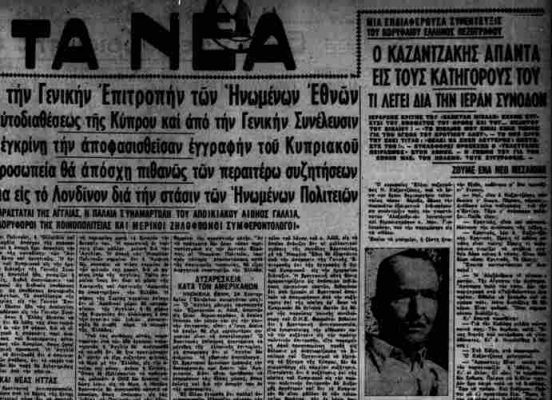 Από τη Mixanitouxronou.gr: Ο Νίκος Καζαντζάκης σε συνέντευξή του στην εφημερίδα «Τα Νέα», τρία χρόνια πριν από τον θάνατό του κι ενώ έχει χάσει ήδη την όρασή του από το ένα μάτι, θα μιλήσει για τους επικριτές του και την Ιερά Σύνοδο*. Η συνέντευξη δόθηκε στον Αλεξανδρινό λογοτέχνη και δημοσιογράφο Μανόλη Γιαλουράκη και έγινε στο σπίτι του Καζαντζάκη στην πόλη Αντίμπ της Νότιας Γαλλίας. Δημοσιεύτηκε στις 24/11/54 με τίτλο: «Μια ενδιαφέρουσα συνέντευξις του κορυφαίου Ελλήνος πεζογράφου- Ο Καζαντζάκης απαντά εις τους κατήγορους του- τι λέγει δια τη ιεραν Σύνοδον». Διατηρήθηκε η ορθογραφία.