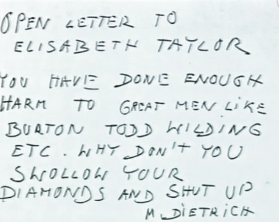 «Ανοιχτή επιστολή προς την Ελίζαμπεθ Τέιλορ: Έχεις προκαλέσει αρκετό κακό σε υπέροχους άντρες όπως ο Μπάρτον, ο Τοντ, ο Γουάιλντινγκ και άλλοι. Γιατί δεν καταπίνεις τα διαμάντια σου να σκάσεις; Μαρλέν Ντίτριχ».