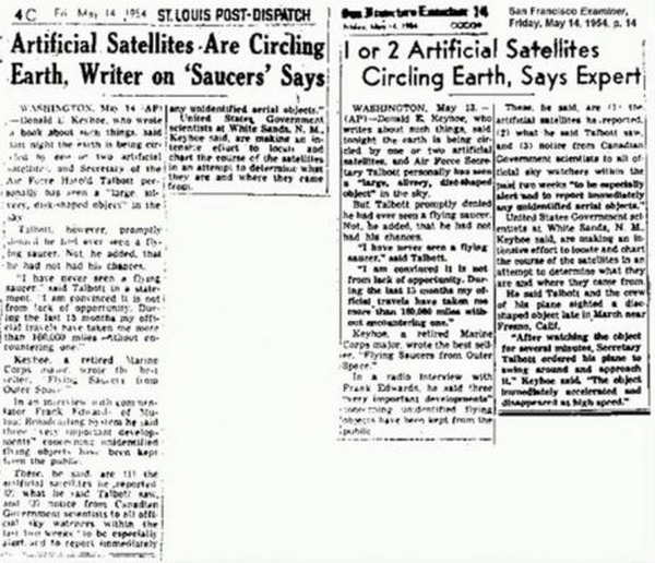 Όλα άρχισαν το 1954 όταν δημοσιεύματα αμερικανικών εφημερίδων ανέφεραν ότι η αεροπορία των ΗΠΑ είχε εντοπίσει στην τροχιά της Γης δύο δορυφόρους, παρά το ότι εκείνη την εποχή ουδείς είχε την τεχνογνωσία να θέσει σε τροχιά τεχνητούς δορυφόρους.