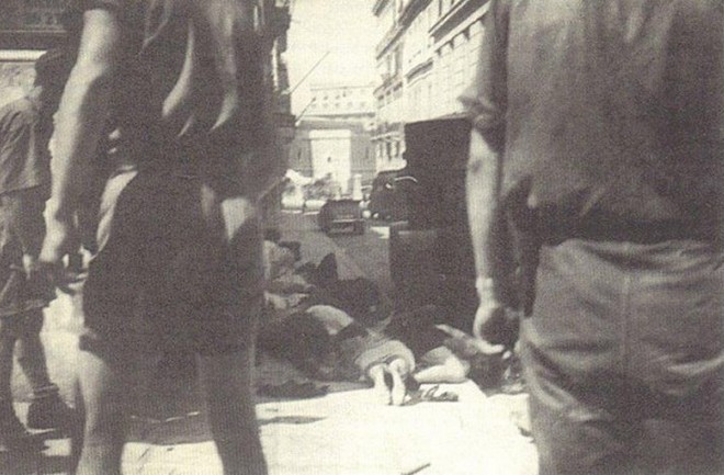 Ωστόσο, το κίνημα των μεγάλων διαδηλώσεων του λαού της Αθήνας σε απώλειες, γινόταν όλο και μεγαλύτερο. Στη φωτογραφία ντοκουμέντο διακρίνονται οι πρώτοι νεκροί πάνω στο πεζοδρόμιο της Πανεπιστημίου. Ήταν μέρα μεσημέρι στο κέντρο της Αθήνας και ήδη η διαδήλωση μετρούσε τα πρώτα της θύματα…