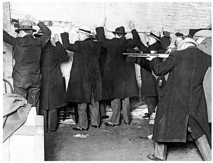 Την περίοδο της ποτοαπαγόρευσης στην Αμερική, το ποτό είχε μεγαλύτερη αξία κι απ’ το χρυσάφι. Πριν όμως φτάσει το φορτηγό, έκαναν ξαφνική έφοδο οι αστυνομικοί. Έστησαν τα μέλη της συμμορίας στον τοίχο και άρχισαν να τους ψάχνουν. Τότε, στην είσοδο εμφανίστηκαν δύο άλλοι άνδρες, ντυμένοι με πολιτικά και οπλισμένοι με τα περιβόητα πολυβόλα “Thompson”. Αυτό το εύχρηστο και ελαφρύ όπλο είχε γίνει ανάρπαστο ανάμεσα στους γκάνγκστερ, καθώς μπορούσε να ρίξει περισσότερες από 100 σφαίρες το λεπτό και να “καθαρίσει” κάθε εμπόδιο. Οι άγνωστοι οπλοφόροι άνοιξαν πυρ εναντίον των ανδρών που στέκονταν, ανυποψίαστοι, κοιτώντας τον τοίχο. Τους γάζωσαν. Αργότερα, η αστυνομία υπολόγισε ότι χρησιμοποιήθηκαν περισσότερες από 200 σφαίρες, ενώ 100 από αυτές βρήκαν τον στόχο τους.