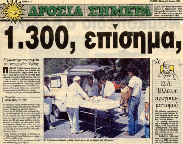 Ήταν 22 Ιουλίου όταν το θερμόμετρο άρχισε να ανεβαίνει επικίνδυνα σε πολλές περιοχές της χώρας. Στην Αθήνα, το πρόβλημα ήταν εντονότερο λόγω του νέφους που τότε ήταν σε υψηλά επίπεδα. Το τσιμέντο στα κτίρια πύρωνε τους τοίχους και για πρώτη φορά δεν δρόσιζε ούτε το βράδυ.