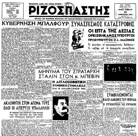 26 Ιανουαρίου 1947. Ο Ριζοσπάστης κυκλοφορούσε με πρωτοσέλιδο τίτλο «Δαυίδ Μπαλφούρ ή ο Πάτερ Δημήτριος». Η κεντρική φωτογραφία του πρωτοσέλιδου ήταν χωρισμένη στα δύο. Στη μια πλευρά απεικονίζονταν ένας παπάς και στην άλλη ένας μεγαλόσωμος μεσήλικας καλοντυμένος κύριος.