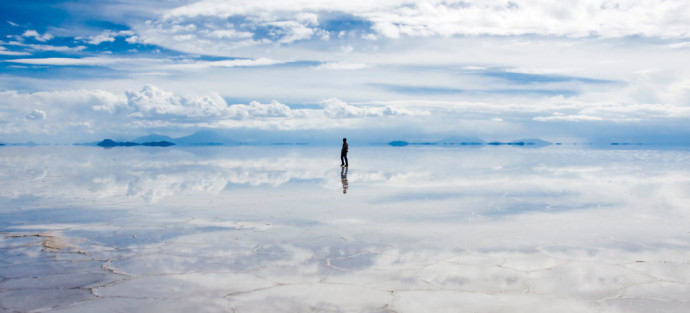 Μπορεί αυτή η φωτογραφία να παραπέμπει σε προϊόν φωτομοντάζ, αλλά είναι πραγματική! Πρόκειται για τον μεγαλύτερο φυσικό καθρέφτη του κόσμου που βρίσκεται στην νοτιοδυτική Βολιβία, στη Νότια Αμερική. Αυτό το εντυπωσιακό θέαμα δημιουργείται όταν σε ένα λεπτό στρώμα νερού υπάρχουν τεράστιες ποσότητες αλατιού.