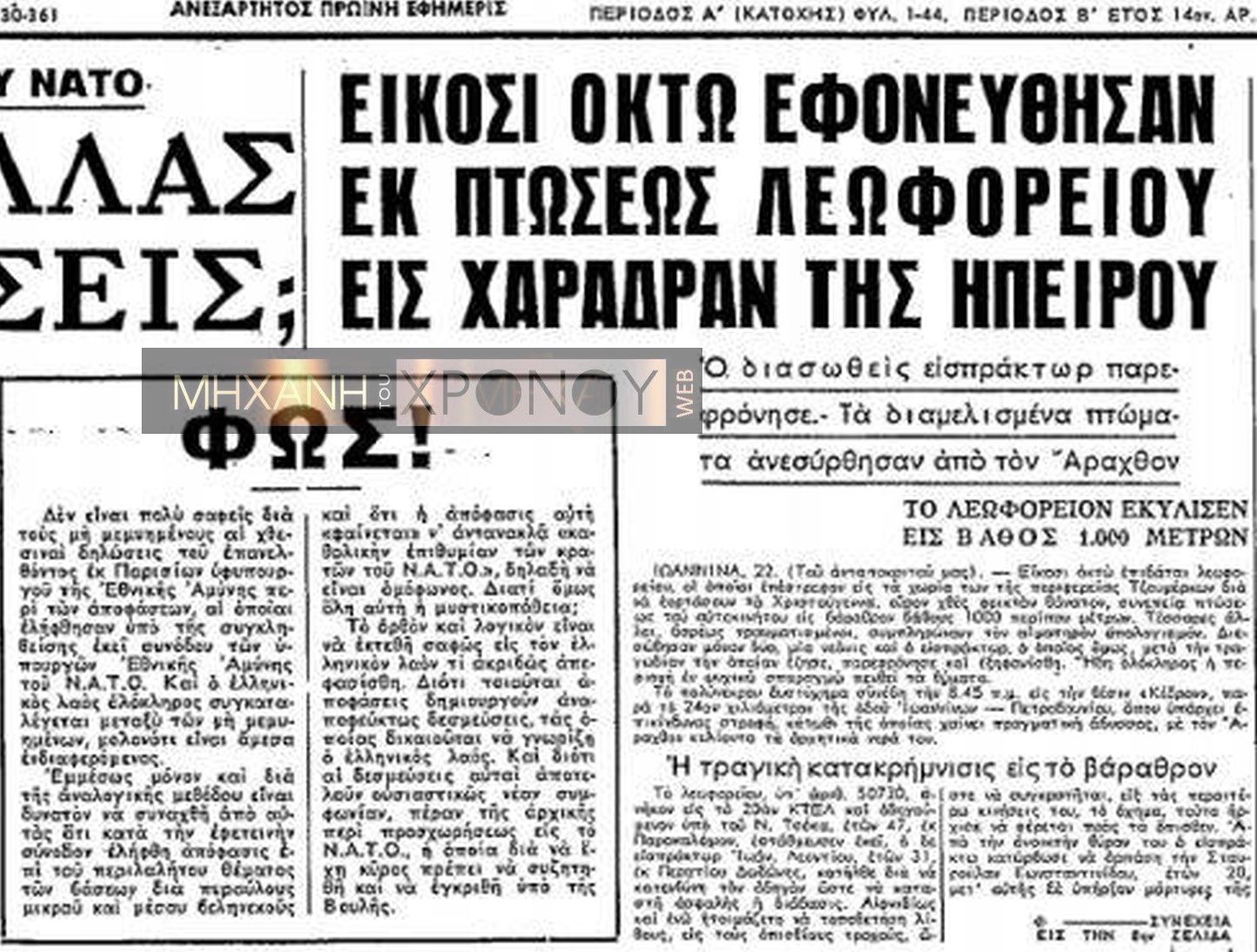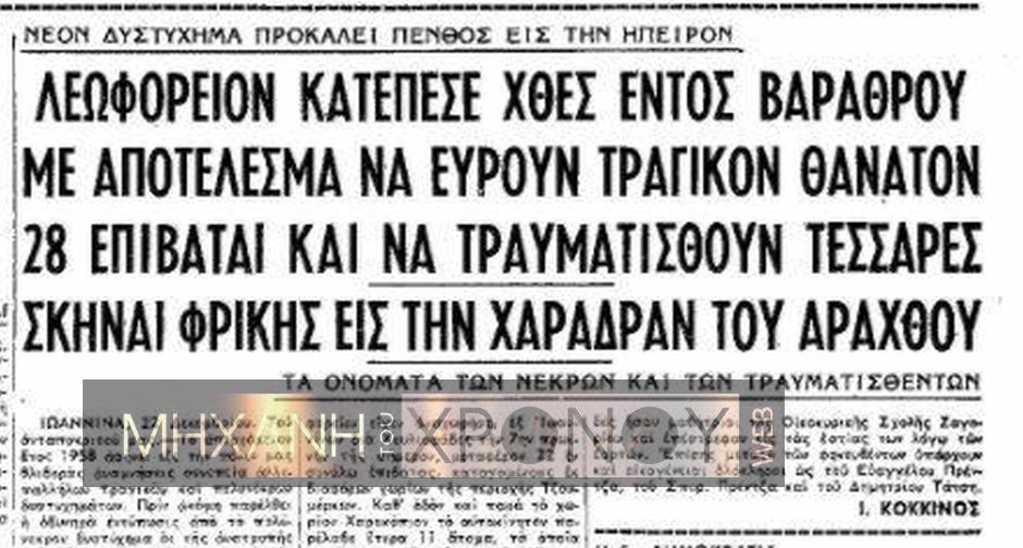 Το λεωφορείο έπεσε σε βάθος 300 μέτρων στο 24ο χλμ Ιωαννίνων-Πετροβουνίου. 29 άνθρωποι σκοτώθηκαν. 12 άντρες και 17 γυναίκες. Εφημερίδα «Το Βήμα»