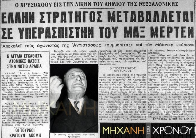 Ο ναζί εγκληματίας Μάξ Μέρτεν (αριστερά) στη δίκη τον Φεβρουάριο του 1959, βρήκε ένθερμη υποστήριξη από τον στρατηγό Χρυσοχόου ο οποίος στην κατοχική Θεσσαλονίκη εκτελούσε χρέη Γενικού Επιθεωρητή Μακεδονίας προδίδοντας τις κινήσεις της ελληνικής αντίστασης