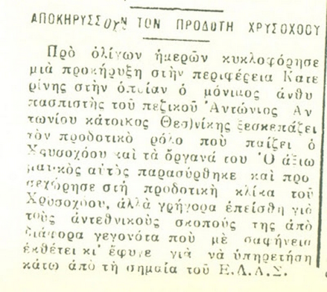 Είναι χαρακτηριστική μία είδηση που δημοσίευσε στις 24 Απριλίου 1943 η μυστική εφημερίδα της Αντίστασης “Ελευθερία”, αναφέροντας την περίπτωση του ανθυπασπιστή του Στρατού, Αντώνιου Αντωνίου: “Ο αξιωματικός αυτός παρασύρθηκε και προσχώρησε στην κλίκα του Χρυσοχόου, αλλά γρήγορα επείσθη για τους αντεθνικούς σκοπούς της από διάφορα γεγονότα που με σαφήνεια εκθέτει και έφυγε για να υπηρετήσει κάτω από τη σημαία του ΕΛΑΣ”.