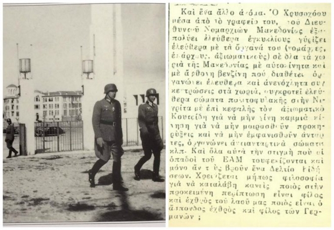 Αριστερά: Ναζί στη Θεσσαλονίκη. Δεξιά: η συνέχεια του άρθρου στην εφημερίδα “Ελευθερία” για τη δράση του Χρυσοχόου