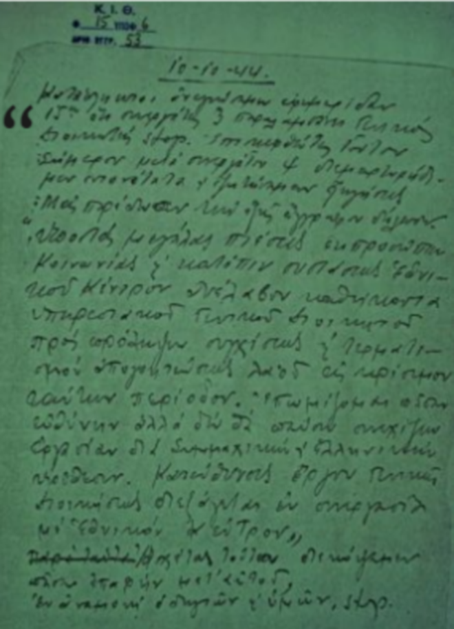 “Κατάπληκτοι ανεγνώσαμεν εφημερίδαν 15ης ότι συνεργάτης 3 (ο Χρυσοχόου) παραλαμβάνει Γενικός Διοικητής stop. Επισκεφθέντες τούτον σήμερον μετά συνεργάτου 4, διεμαρτυρήθημεν εντονότατα και εζητήσαμεν εξηγήσεις. Μας παρέδωσεν την εξής έγγραφον δήλωσιν: “Υποστάς μεγάλας πιέσεις εκπροσώπων κοινωνίας και κατόπιν συστάσεως εθνικού κέντρου ανέλαβον καθήκοντα υπηρεσιακού Γενικού Διοικητού προς πρόληψιν συγχίσεως και τερματισμόν απογοητεύσεως λαού εις κρίσιμον ταύτην περίοδον. Επωμίζομαι πάσαν ευθύνην αλλά δεν θα παύσω συνεχίζων εργασίαν δια Συμμαχικήν και Ελληνικήν υπόθεσιν. Κατεύθυνσις έργου Γενικής Διοικήσεως διεξάγεται εν συνεργασία με εθνικόν κέντρον. Ασχέτως τούτου διεκόψαμεν πάσαν επαφήν μετ’ αυτού, εν αναμονλή οδηγιών και υμών stop.”
