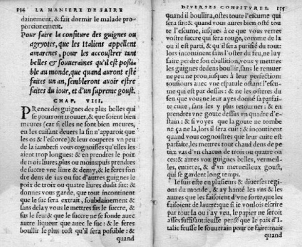 Η συνταγή για τη μαρμελάδα συμπεριλήφθηκε στο πρώτο βιβλίο του Νοστράδαμου που εκδόθηκε το 1552 και είχε τίτλο “Εξαιρετική και χρήσιμη πραγματεία για όσους θέλουν να γνωρίζουν πολλές, καταπληκτικές συνταγές. Νεοσυγκροτηθείσες από τον Κύριο Μισέλ ντε Νοστρεντάμ, Δόκτωρ Ιατρικής στην πόλη Σαλόν ντε Κρο στη Προβηγκία”.