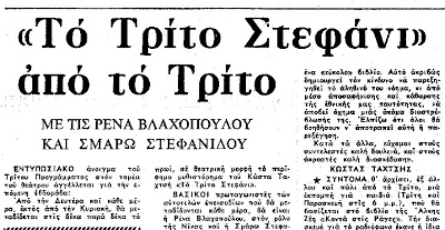 Την εποχή που το Τρίτο Πρόγραμμα της Ελληνικής Ραδιοφωνίας γινόταν το αγαπημένο μέσο φίλων του πολιτισμού, μετέδιδε εκπομπές και προγράμματα με ειδική αξία που οι ακροατές του δεν έχαναν με τίποτα. Μια τέτοια ήταν η ραδιοφωνική απόδοση του έργου ΤΟ ΤΡΙΤΟ ΣΤΕΦΑΝΙ του Κώστα Ταχτσή σε συνέχειες. Τους δύο ιστορικούς ρόλους της Νίνας και της Εκάβης έπαιζαν η Ρένα Βλαχοπούλου και η Σμάρω Στεφανίδου. Ο Γιώργος Παυριανός που είχε την επιμέλεια και τη σκηνοθεσία, αφηγήθηκε το 2008, πως προέκυψε αυτή η συνεργασία, αλλά και το έντονο παρασκήνιο της: