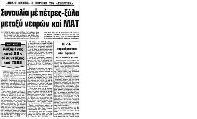 Η εφημερίδα ΤΑ ΝΕΑ περιγράφει τα επεισόδια: “Οι άνδρες των ΜΑΤ επιτέθηκαν με βιαιότητα και οι νεαροί άρχισαν να πετούν εναντίον τους πέτρες, ξύλα και ό,τι αντικείμενο έβρισκαν. Οι νεαροί όμως δεν περιορίστηκαν σε αυτό, αλλά σε έξαλλη κατάσταση όπως ήταν, έσπαγαν βιτρίνες καταστημάτων και τα τζάμια των παρκαρισμένων αυτοκινήτων. Οι ζημιές είναι αρκετά εκτεταμένες”