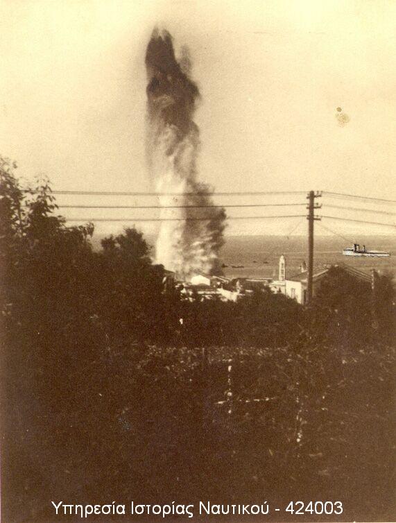 Στιγμιότυπο από την έκρηξη της δεύτερης τορπίλης στον λιμενοβραχίονα της Τήνου