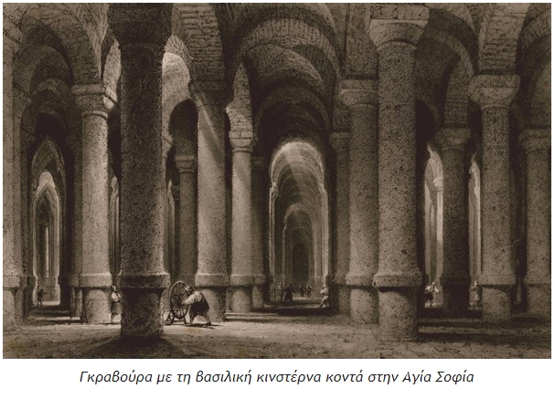 Η κινστέρνα είχε, αρχικά, 336 μαρμάρινους κίονες ύψους 8 μέτρων, τοποθετημένους σε 12 σειρές με 28 κίονες η καθεμία, σε απόσταση 4 μέτρων η μία από την άλλη. Ήταν από τα σημαντικότερα δημόσια έργα του Ιουστινιανού, με σκοπό την ύδρευση της Πόλης και αποτελούσε εξαίρετο δείγμα βυζαντινής μηχανικής. Το 1937 άρχισαν έρευνες στο υπέδαφος της Αγίας Σοφίας. Οι έρευνες διακόπηκαν, λόγω της έναρξης του Β´ Παγκόσμιου Πολέμου.