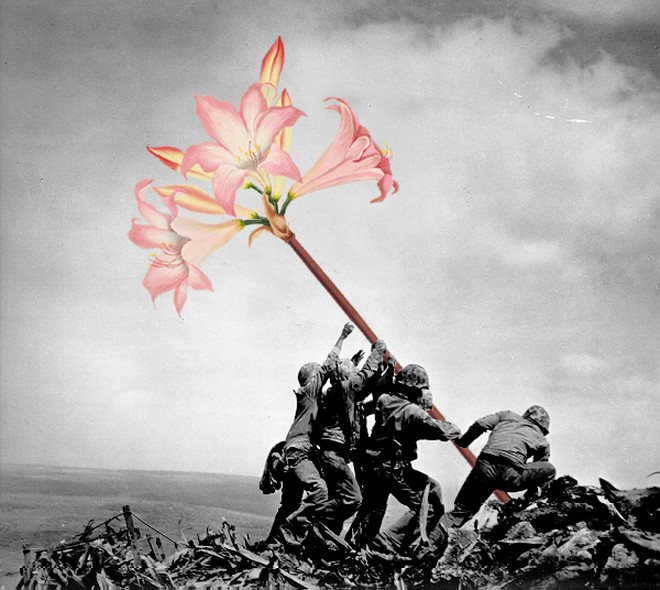 Αίσθηση προκαλεί το φωτογραφικό κολάζ ενός καλλιτέχνη που είχε την έμπνευση να επεξεργαστεί κλασικές ασπρόμαυρες ιστορικές φωτογραφίες του πολέμου και να αντικαταστήσει τα όπλα των στρατιωτών με πολύχρωμες εικόνες λουλουδιών.