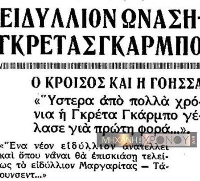 Το 1955 η Γκάρμπο ήταν πενήντα χρόνων. Εκείνη την περίοδο, οι φήμες οργίαζαν σχετικά με τη σχέση της με τον Αριστοτέλη Ωνάση. Χαρακτηριστικά, τα ελληνικά δημοσιεύματα ανέφεραν ότι ο Ωνάσης ήταν τρελά ερωτευμένος μαζί της και έγραφαν «Ο Κροίσος και η Γόησσα. Ύστερα από πολλά χρόνια η Γκρέτα Γκάρμπο γέλασε για πρώτη φορά…».