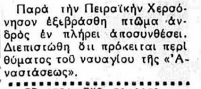 Η Πειραϊκή για αρκετό καιρό μετά την τραγωδία θεωρείτο «καταραμένος τόπος», καθώς εκεί εκβράζονταν διαρκώς τα πτώματα του ναυαγίου, ο συνολικός αριθμός των οποίων έφτασε στα 28! Το τραγούδι «Οι αδικοπνιγμένοι»: Η καταβύθιση του «Ανάστασις» έμεινε χαραγμένη ως ανάμνηση για αρκετό καιρό και έπρεπε να μεσολαβήσουν τα τραγικά γεγονότα του πολέμου και της κατοχής όπου οι εκατόμβες των αμάχων από την πείνα και τους βομβαρδισμούς της πόλης, πέρασαν το ναυάγιο του «Ανάστασις» σε δεύτερη μοίρα. Η καταβύθιση του «Ανάστασις» έφτασε να γίνει τραγούδι με τίτλο «Οι αδικοπνιγμένοι» από τον Κώστα Ρούκουνα. Το τραγούδι έγινε δίσκος από την ODEON που γρήγορα όμως αποσύρθηκε από το καθεστώς του Μεταξά.