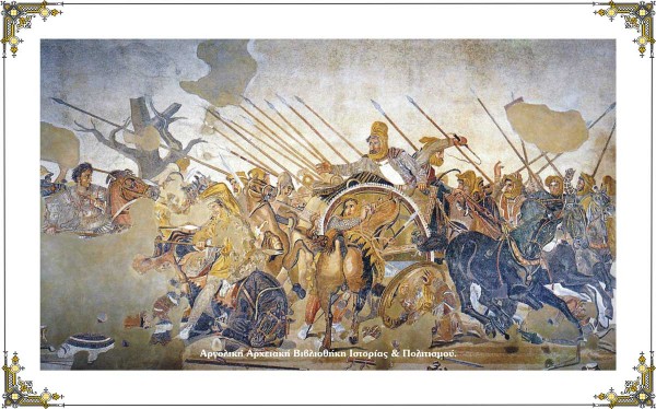Ο Μέγας Αλέξανδρος εφορμά εναντίον του Δαρείου Γ΄στη μάχη της Ισσού. Η επιμονή του Ελληνα στρατηλάτη να μάχεται σαν απλός στρατιώτες δημιουργούσε πολλούς πονοκεφάλους στους υπασπιστές του. Για πολλοστή φορά τον έσωσαν στην πολιορκία της πόλης των Μαλλών.