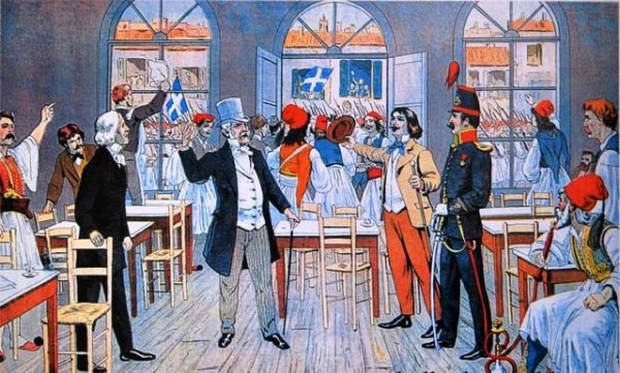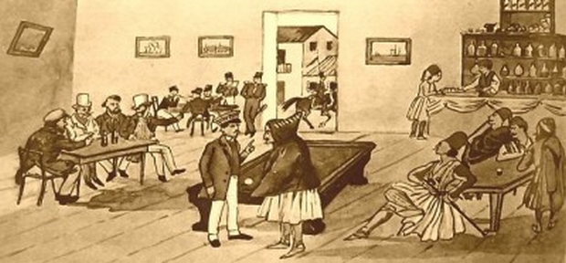 Σε ατιτλοφόρητο φυλλάδιο του 1863, ο συντάκτης έγραφε ότι το καφενείο, «δύναται να θεωρηθεί ως η κεντρική διεύθυνσις της εκκλησίας του λαού. Εκεί δικάζονται βασιλείς και υπουργοί, εκεί αποκαλύπτονται επιτηδείως πρόσωπα και ενέργειες, εν αυτώ η νεότης αντιτάσσει την οιστρήλατον ευφυΐαν της εις τας αυστηράς κρίσεις των γερόντων». Συχνά πολλοί νέοι που περνούσαν από το καφενείο και ήταν αντίθετοι με το καθεστώς της μοναρχίας, κρατούσαν στα χέρια τους την ιστορία της Γαλλικής Επανάστασης και διάβαζαν φωναχτά τους λόγους του Μιραμπό και του Ροβεσπιέρου. Οι συζητήσεις των αντιμοναρχικών νέων συνεχίζονταν συνήθως στα γραφεία του αντιπολιτευόμενου φύλλου «Το μέλλον της Πατρίδας», που θεωρούνταν ως η νοητή επέκταση του πολιτικού καφενείου.