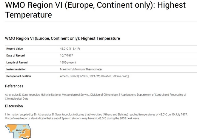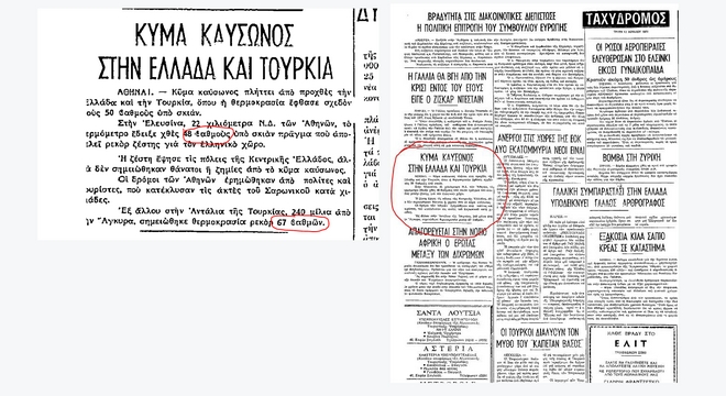 Σαν σήμερα πριν 41 χρόνια καταγράφηκαν 48 βαθμοί Κελσίου στην Ελευσίνα και στο Τατόι και αυτή η τιμή είναι η πιο υψηλή θερμοκρασία που έχει καταγραφεί ποτέ, όχι μόνο στην Ελλάδα αλλά και σε όλη την Ευρώπη (και ως τέτοια είναι καταγεγραμμένη στα επίσημα αρχεία του Παγκόσμιου Μετεωρολογικού Οργανισμού). Σημειώνεται οτι την ίδια μέρα το θερμόμετρο έγραψε 44 °C στη Ν. Φιλαδέλφεια, 42 °C στο κέντρο της Αθήνας και 44 °C στη Λάρισα.