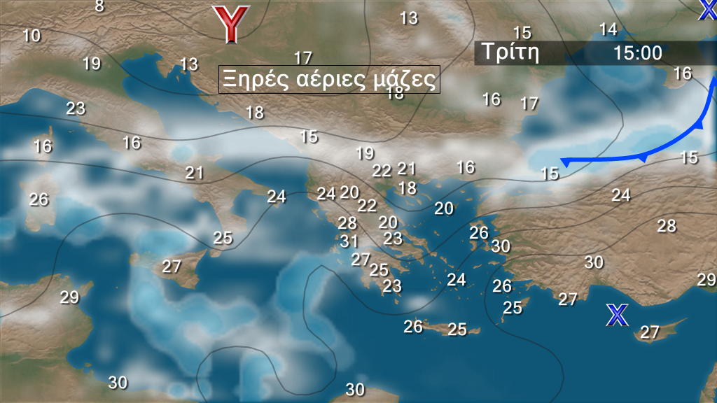 Οι αέριες μάζες θα είναι ξηρές και σε πρώτη φάση δεν προβλέπεται να μας επηρεάσουν με σημαντικά φαινόμενα , όμως τις επόμενες ημέρες πάνω από τις θαλάσσιες υγρές και ζεστές περιοχές θα δημιουργηθούν ευνοϊκές συνθήκες για πολλές βροχές κυρίως στα νότια.