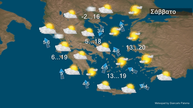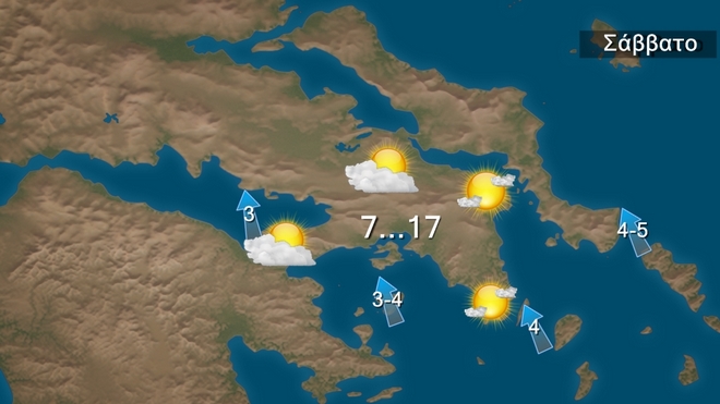 Το Σάββατο προβλέπεται γενικά αίθριος καιρός. Αραιές νεφώσεις θα αναπτυχθούν βαθμιαία στα δυτικά και βόρεια που το βράδυ στα δυτικά θα πυκνώσουν.