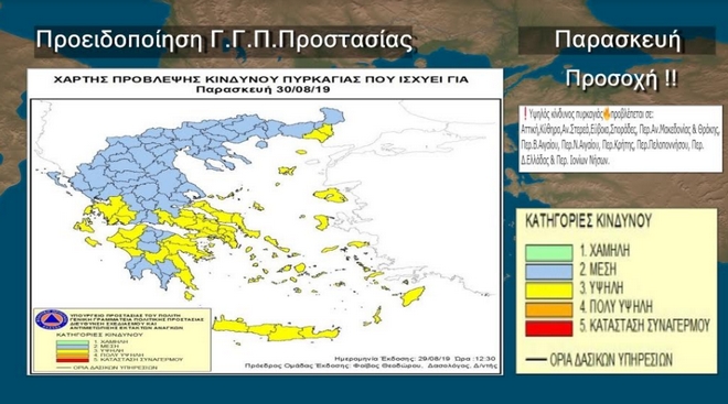 Από πλευράς επικινδυνότητας πυρκαγιών την Παρασκευή θα έχουμε Υψηλό Κίνδυνο Πυρκαγιάς σε Αττική,Κύθηρα, Αν.Στερεά, Εύβοια, Σποράδες, Περ. Αν. Μακεδονίας & Θράκης, Περ. Β. Αιγαίου, Περ. Ν. Αιγαίου, Περ. Κρήτης, Περ. Πελοποννήσου, Περ. Δ. Ελλάδας & Περ. Ιονίων Νήσων σύμφωνα με την πρόβλεψη της Γενικής Γραμματείας Πολιτικής Προστασίας.