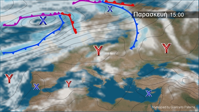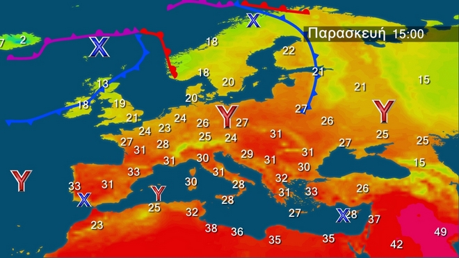 Στον γενικό χάρτη της Ευρώπης διακρίνεται ο αντικυκλώνας στη Κεντρική και Ανατολική Ευρώπη που εκτείνεται μέχρι τα βόρεια Βαλκάνια και ο οποίος συνδυάζεται με το καμηλό στην περιοχή της Κύπρου προκαλώντας τους ισχυρούς βοριάδες στο Αιγαίο. Δύο άλλα ισχυρά χαμηλά θα επηρεάσουν τη Βόρεια Ευρώπη με πολλές βροχές.