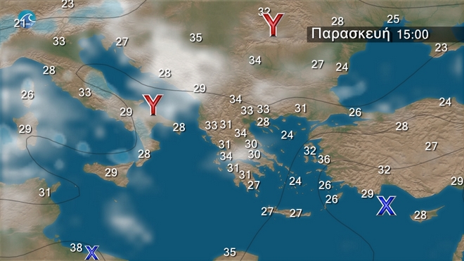 Την Παρασκευή προβλέπεται γενικά αίθριος καιρός και μόνο τις μεσημβρινές και απογευματινές ώρες θα αναπτυχθούν τοπικές νεφώσεις και στα βορειοδυτικά και υπάρχει πιθανότητα για λίγες μπόρες στη Δυτική Μακεδονία Οι άνεμοι θα πνέουν από βόρειες διευθύνσεις στα δυτικά 3 με 5, στα ανατολικά 5 με 7 και στο Αιγαίο τοπικά 7 μποφόρ. Η θερμοκρασία θα φτάσει στα βόρεια και κεντρικά ηπειρωτικά τους 35 με 36 βαθμούς στα δυτικά τοπικά 37 βαθμούς, στις Κυκλάδες τους 30 στη νότια Κρήτη τους 34 και στο Ανατολικό Αιγαίο τους 35 βαθμούς Κελσίου.