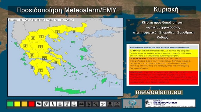Την Κυριακή θα ανέβει η θερμοκρασία σε όλη τη χώρα. Υπάρχει προειδοποίηση με κίτρινο χρώμα για τις υψηλές θερμοκρασίες σε όλα τα ηπειρωτικά, τη Θάσο, Σαμοθράκη και Κύθηρα.