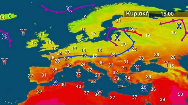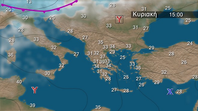 Την Κυριακή προβλέπεται γενικά αίθριος καιρός. Οι άνεμοι θα είναι βορειοδυτικοί 3 με 5 και στο Αιγαίο τοπικά 6 μποφόρ. Η θερμοκρασία θα σημειώσει άνοδο στο Ιόνιο και τα ηπειρωτικά και θα φτάσει στα βόρεια τους 37 βαθμούς, στα υπόλοιπα ηπειρωτικά και το Ιόνιο τους 38 με 39 και κατά τόπους τους 40 και στο Αιγαίο τους 32 με 36 βαθμούς Κελσίου.