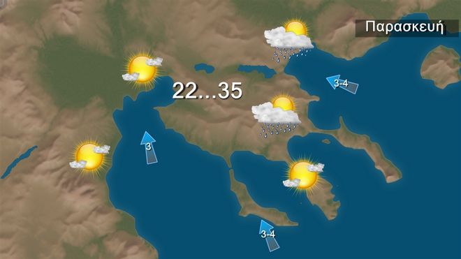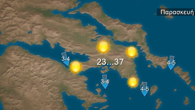 Την Παρασκευή προβλέπεται γενικά αίθριος καιρός στις περισσότερες περιοχές της χώρας και μόνο τις μεσημβρινές και απογευματινές ώρες στα βόρεια ορεινά θα αναπτυχθούν νεφώσεις και θα εκδηλωθούν τοπικές μπόρες. Οι άνεμοι θα πνέουν από βόρειες διευθύνσεις στα δυτικά 3 με 5 μποφόρ τα ανατολικά 4 με 5 και τοπικά στο Νότιο Αιγαίο 5 με 6 μποφόρ. Η θερμοκρασία θα έχει μέγιστη τιμή στα βόρεια τους 37 βαθμούς στα υπόλοιπα ηπειρωτικά και το Ιόνιο τους 37 με 38 και τοπικά 39 και στα νησιά του Αιγαίου τους 33 με 35 βαθμούς Κελσίου.