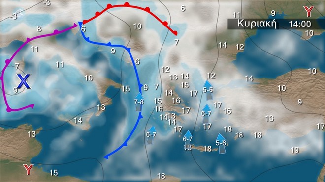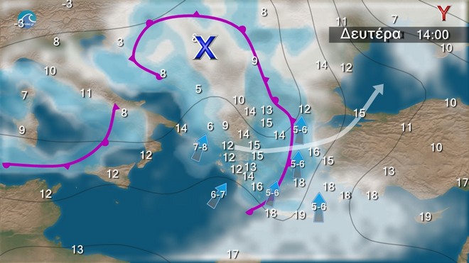 Στην ανατολική νησιωτική χώρα νεφώσεις με τοπικές βροχές, σποραδικές καταιγίδες κυρίως στα Δωδεκάνησα και σταδιακή βελτίωση. Στην υπόλοιπη χώρα λίγες νεφώσεις, αυξημένες στα δυτικά όπου θα σημειωθούν τοπικές βροχές, βαθμιαία μεμονωμένες καταιγίδες και παροδικές χιονοπτώσεις στα ηπειρωτικά ορεινά. Οι άνεμοι θα πνέουν δυτικοί νοτιοδυτικοί 4 με 5 και πρόσκαιρα στα πελάγη τοπικά 6 μποφόρ. Η θερμοκρασία δεν θα σημειώσει αξιόλογη μεταβολή.