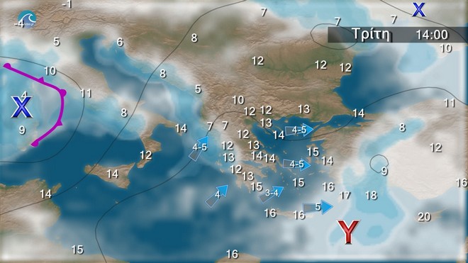 5 με 6 και στο Αιγαίο 7 και πιθανώς τοπικά 8 μποφόρ, που από το απόγευμα θα στραφούν σε δυτικούς νοτιοδυτικούς και θα εξασθενήσουν. Η θερμοκρασία θα σημειώσει μικρή πτώση κυρίως στα δυτικά και τα βόρεια.