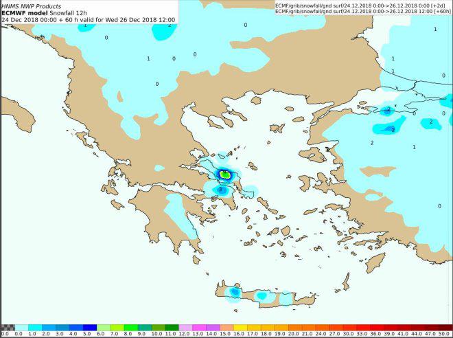 Όπως παρατηρούμε στους χάρτες του υετού τα φαινόμενα θα περιοριστούν κυρίως νοτιότερα, αλλά παρόλα αυτά επειδή στην ανώτερη ατμόσφαιρα θα έρθουν ακόμη ψυχρότερες αέριες μάζες οι χιονοπτώσεις ενδέχεται τοπικά να είναι πυκνές στην Εύβοια, την Αττική και την Ανατολική Πελοπόννησο. Αυτό φαίνεται να συμβαίνει κυρίως στη Κεντρική Εύβοια μέχρι και το μεσημέρι της Τετάρτης (ενδεικτικό υψόμετρο τα 400 μέτρα) . Στην Αττική ένταση των χιονοπτώσεων προβλέπεται στο ίδιο χρονικό διάστημα με ενδεικτικό υψόμετρο τα 500 μέτρα.