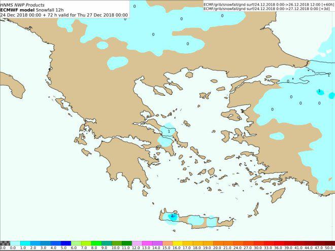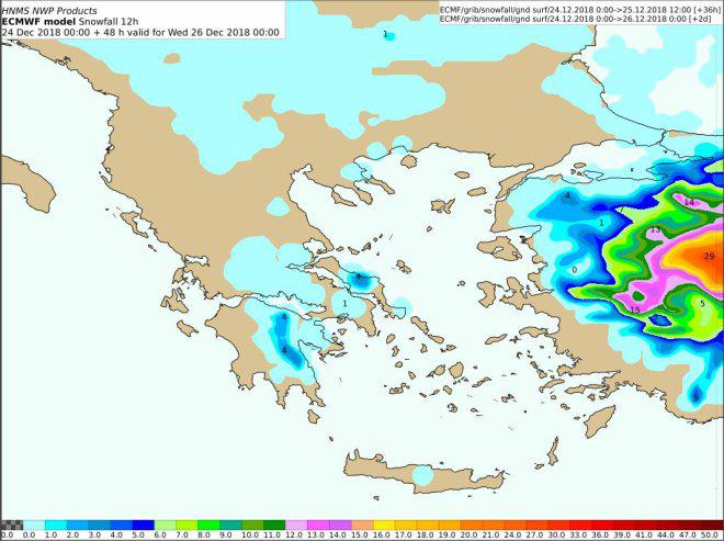 Προβλεπόμενα ύψη χιονιού από Τετάρτη 0000 έως Τετάρτη 1200UTC