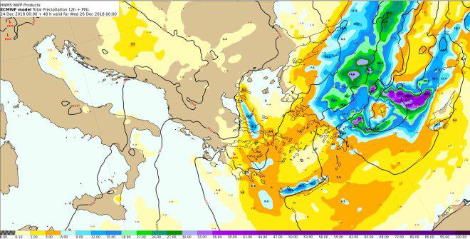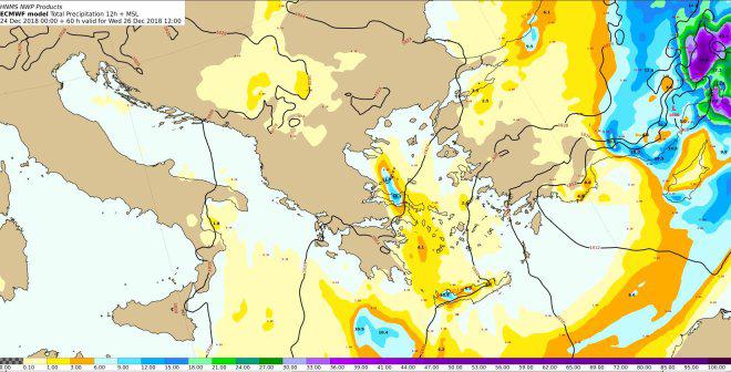 Προβλεπόμενα ύψη υετού 12ωρου για από Τρίτη 1200 έως Τετάρτη 0000UTC